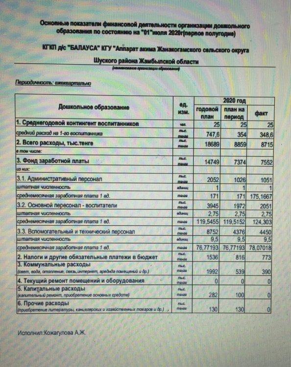 Основные показатели финансовой деятельности за 2 кв 2020 года » КГКП 'Детский сад 'Балауса'